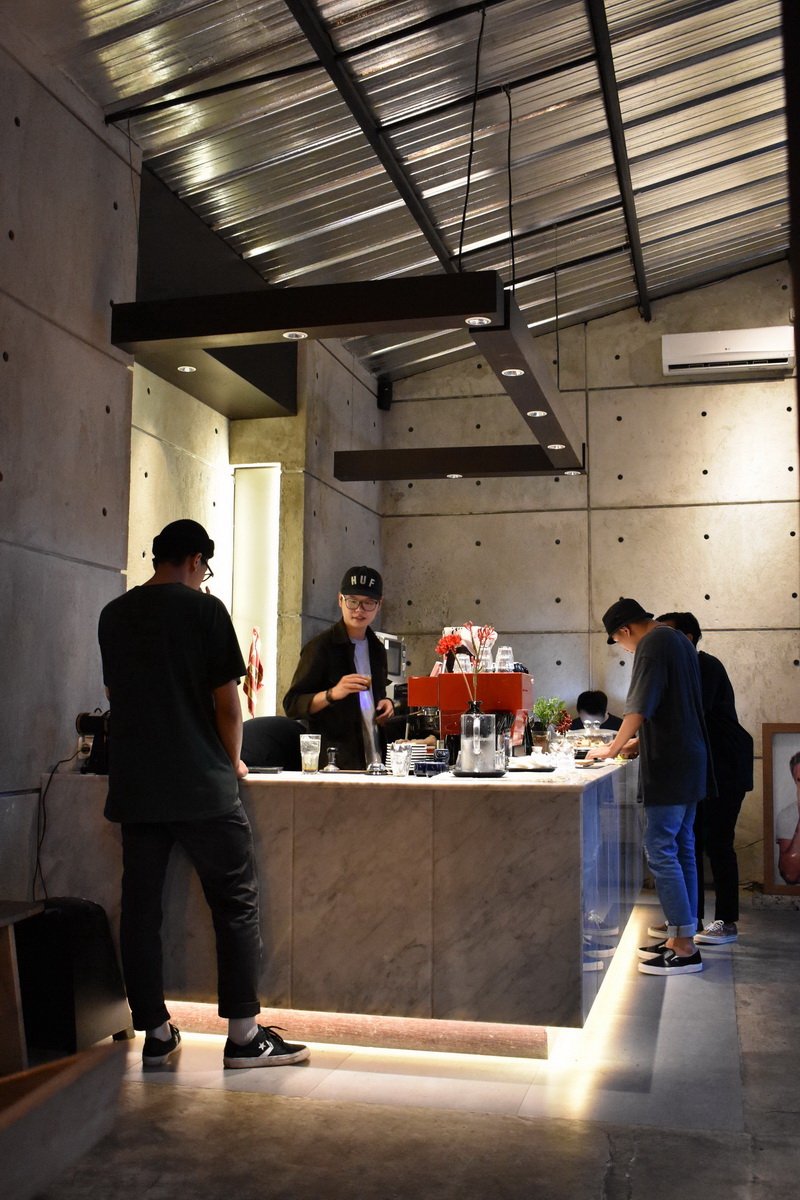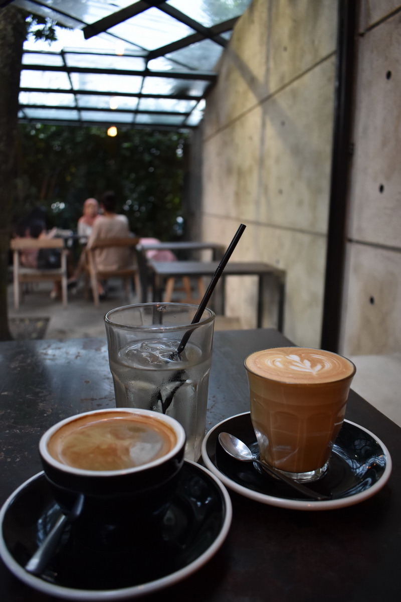 To get to the shop, you’ll first walk up a gravel-lined concrete walkway, and as you make your way, you’ll pass by numerous tree-shaded outdoor garden tables perfect for breezy afternoons. Once in the shop, you’ll find that the space itself is quite straightforward: a minimalistic glass-lined structure with high ceilings, concrete walls, and a simple white marble baristas’ counter decked out in a selection of beans, bakes, and a shinny red single group espresso machine.